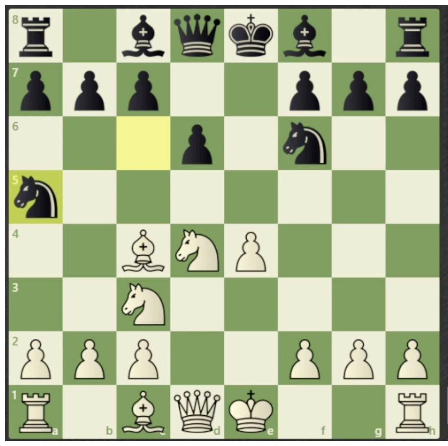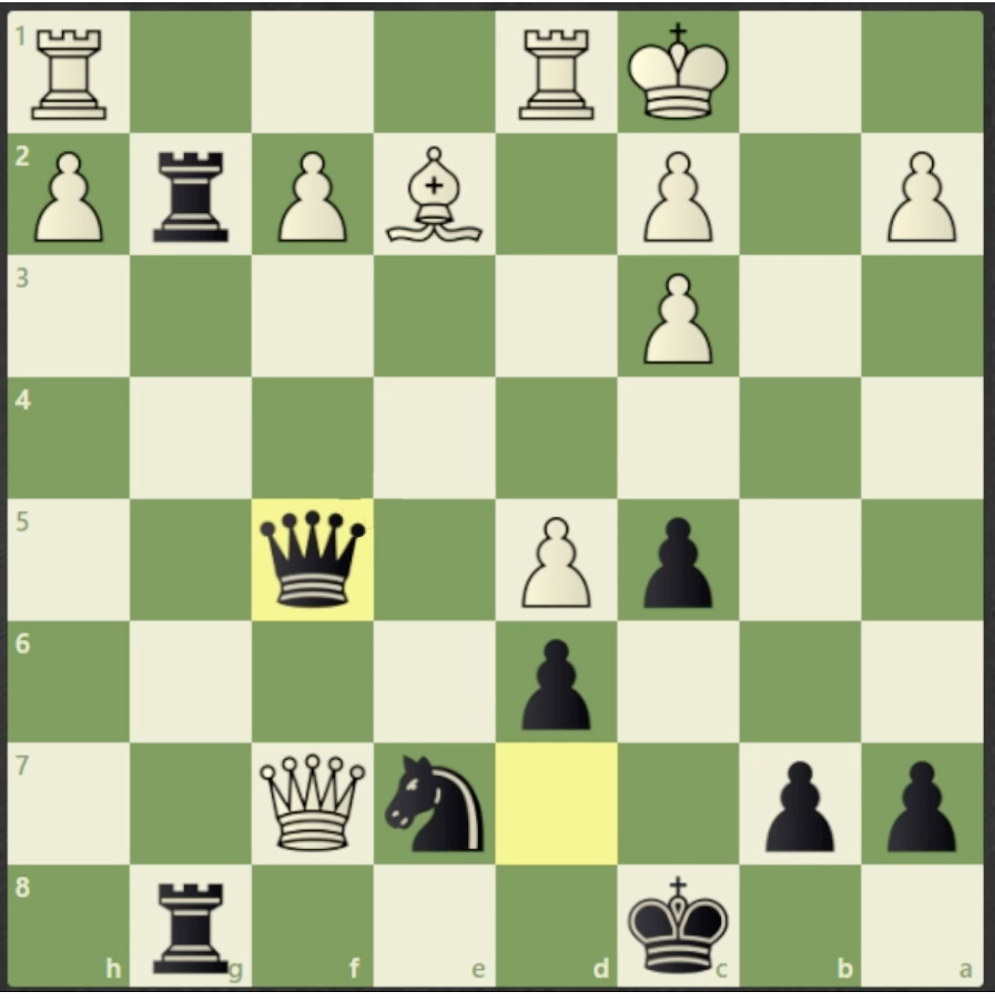 Black moves the Queen to attack f2 pawn, thinking it’s protected by the Knight, but forgets the Queen was protecting the Knight, now White’s Queen takes the knight.