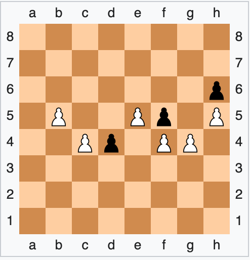 Pawns on b5, c4, and e5 are passed pawns. Black’s pawn on d4 is passed.