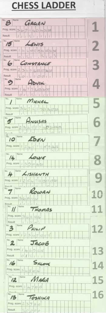 Winners today each get 3 points were :- Advik, Gagan, Thomas, Philip and Eden. Lewis managed to snatch a draw, Maria looking on with sketchbook at the ready. Anyone who took notation of their games get an extra point, that being Gagan, Advick and Michal.