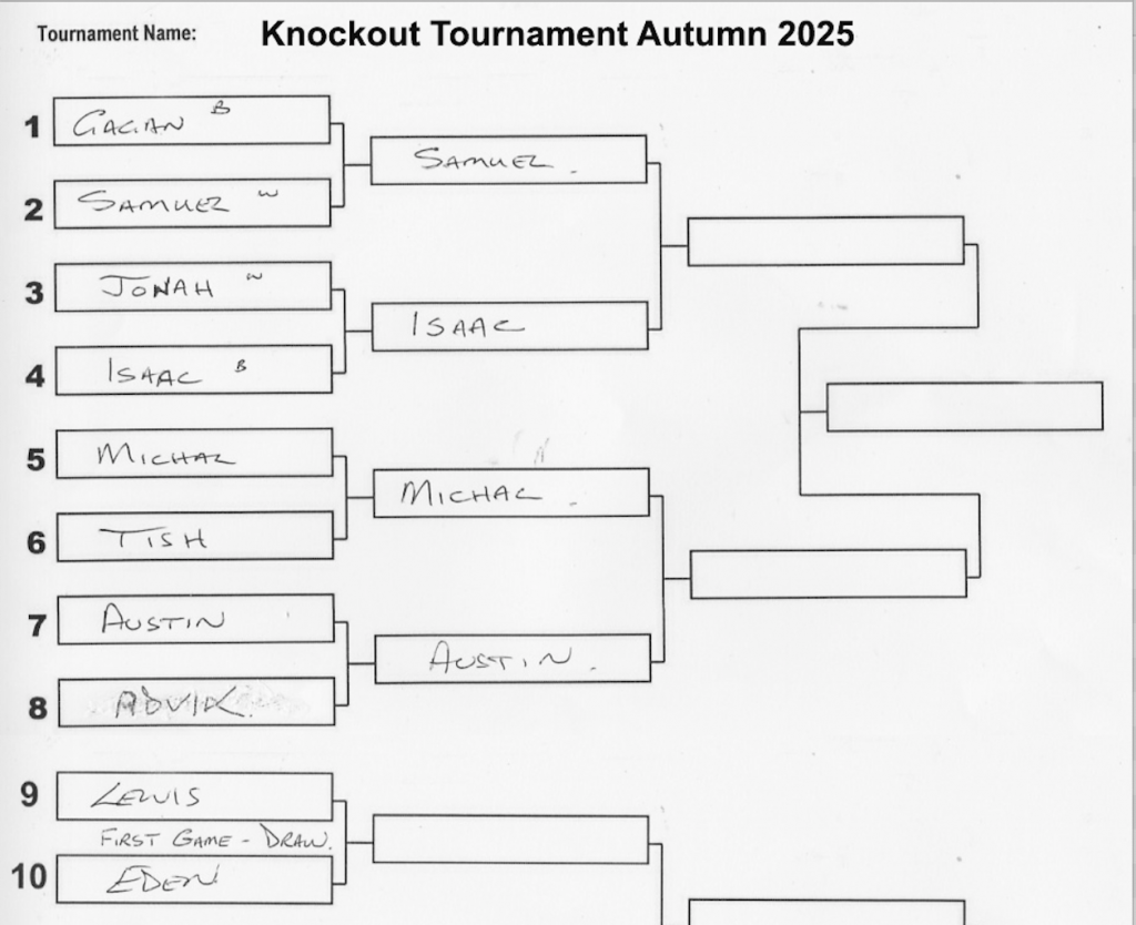 I concentrated on instructing the new members in the fundamentals of the game including opening and endgame techniques before pairing everyone for the opening round of the new Knockout Tournament.