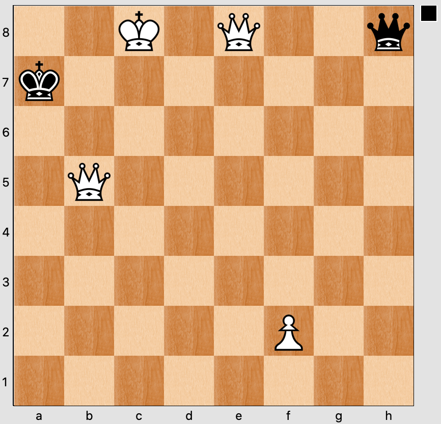 Pawn to f8 = Knight with check and a fork to both King and Queen