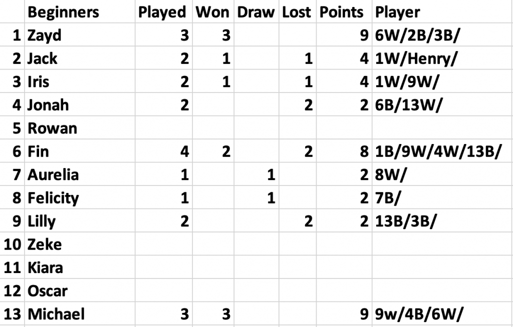 Today brought exciting wins in the beginners group for Zayd, Jack, Iris, Fin, and Michael. Each of these players showcased impressive skills and determination, contributing to their well-deserved victories.