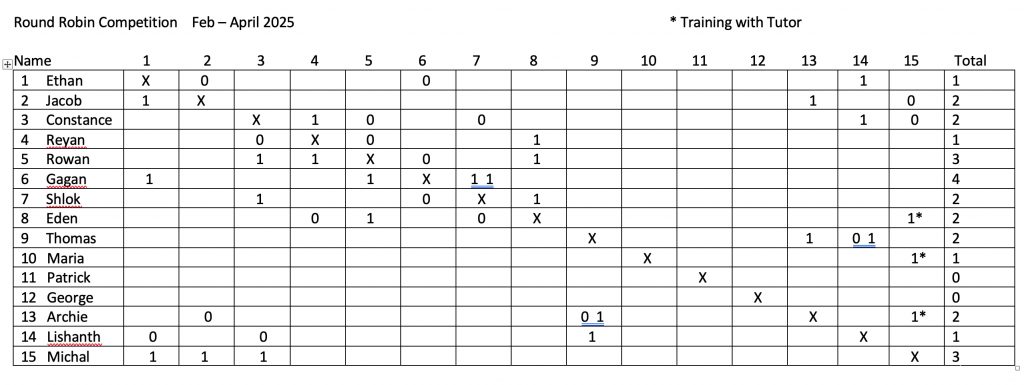 Good wins today for Lishanth, Michal, Thomas, Gagan and a well fought out draw between Rowan and Eden. Gagan leading the way with Rowan and Michal close behind.