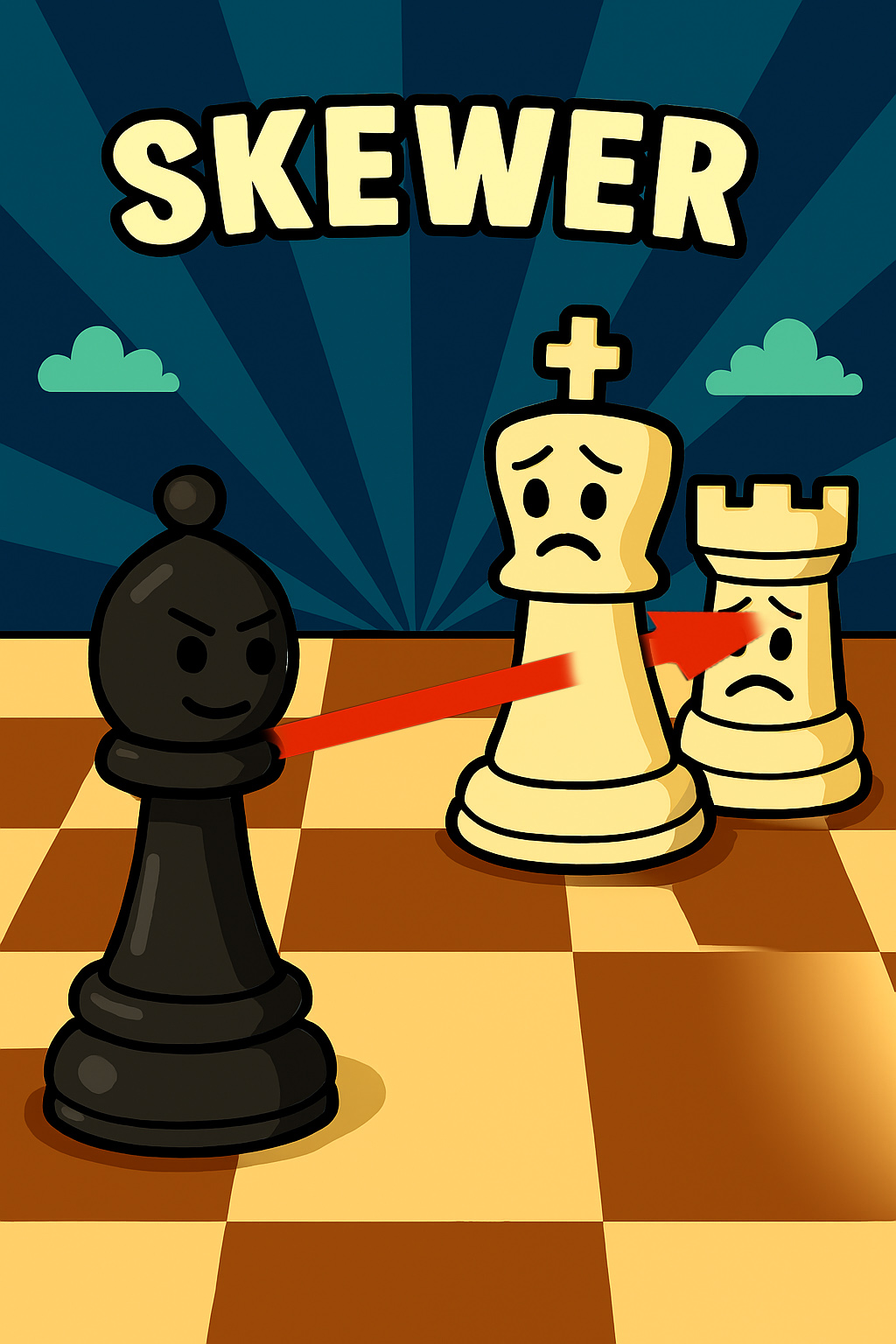 A skewer is a chess tactic where in a line of attack the more important piece is in FRONT of the attack and the secondary piece is behind. Here, if White plays Rook to e1 check, the King can move out of check and the Rook captures the Queen, which should then be an easy win for White.