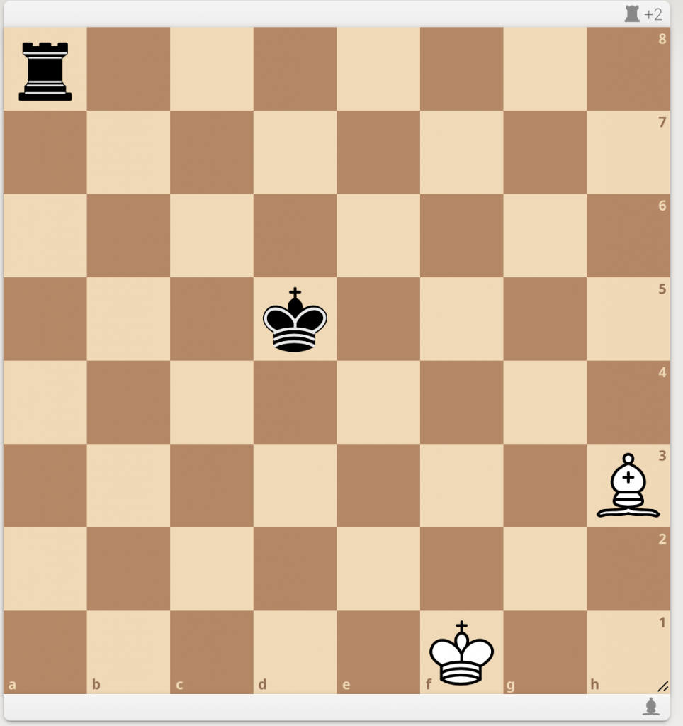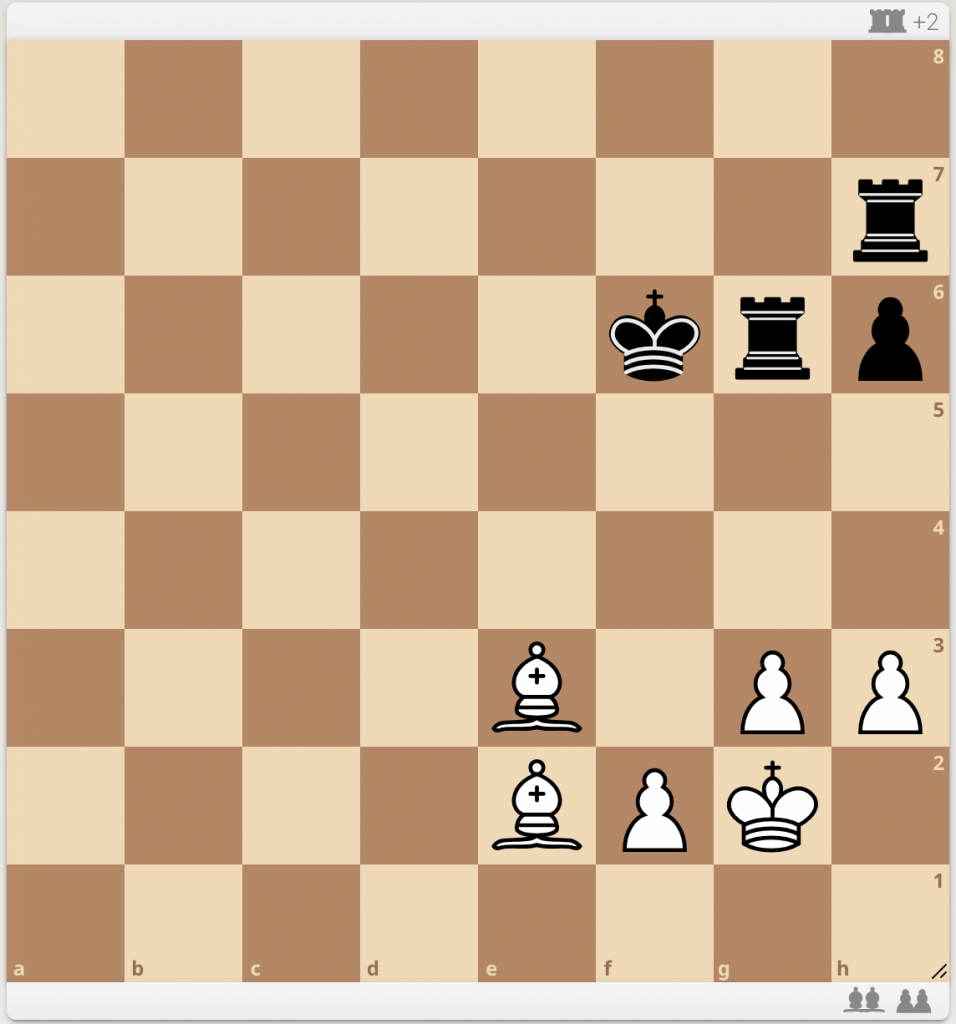 Bishop on e2 (worth 3 points) moves to d3 and skewers both Rooks (worth 5 points each) winning at least one of them
