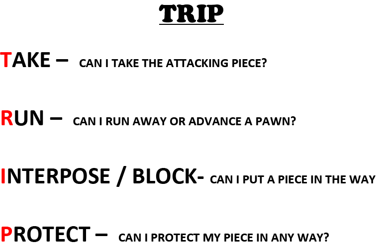A simple method to help you defend your pieces when being attacked is the TRIP method, just ask yourself four questions:-